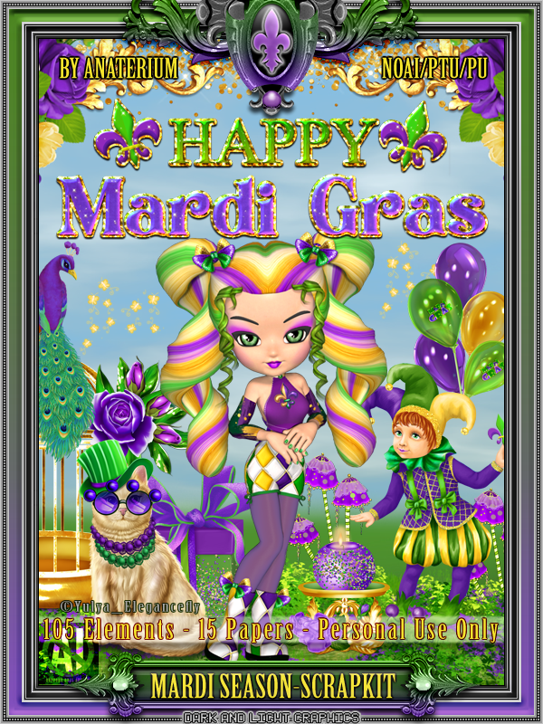 Scrapkit with 105 PNG elements,15 Papers,includes frames and word arts tubes by ©Yulya_Elegancefly ©Angelica Sellers ©Anaterium. Not all of the items are shown on the previews,personal use only. NOT an AI product made to match my set of tubes Mardi Season or Mardi Party but you can use it with any other tube also. ♡Thanks for your visit!♡
